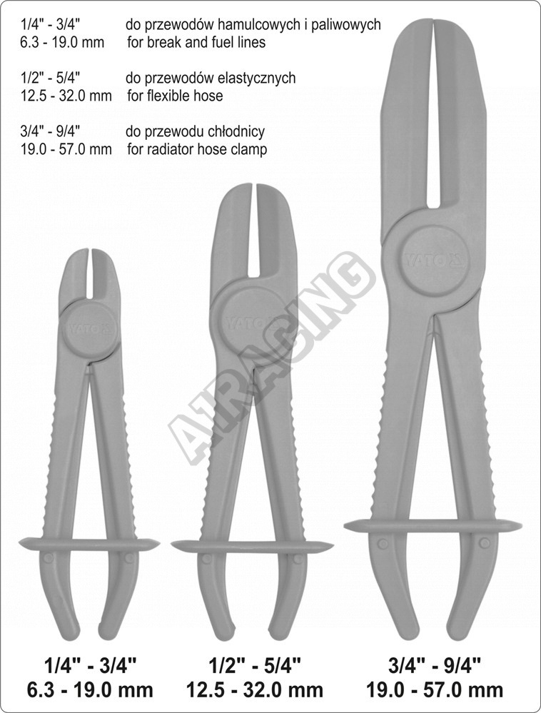 Malá svěrka 6,3 - 19 mm pro brzdové a palivové vedení, střední svěrka 12,5 - 32 mm pro ohebné hadice a velká svěrka 19 - 57 mm pro hadice chladiče.