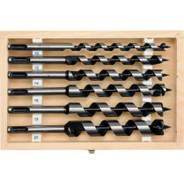 Sada hadovitých vrtáků, pro vrtání hlubokých děr do měkkého i tvrdého dřeva. Vrták má samostředící hrot se závitem, hlavní a pedřezový břit. Plynule odvádí třísku i u mokrého dřeva. Je vyroben z ulíkové oceli a idukčně kalený.