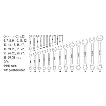 Klíče jsou uložené v pouzdře ze syntetické tkaniny s možností zavěšení, balení obsahuje klíče 6, 7, 8, 9, 10, 11, 12, 13, 14, 15, 16, 17, 18, 19, 20, 21, 22, 23, 24, 25, 26, 27, 28, 30 a 32 mm.