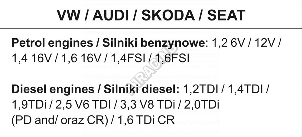 Sada je určena pro benzínové motory 1,2 6V; 1,2 12V; 1.4 - 1.8T 16V a 2,0 16V. Pro naftové motory 1.2 TDI; 1.4 TDI; 1.9 TDI; 2.0 TDI; 1.7 D/TD/SDI/TDI; 1.9 D/TD/SDI/TDI; 2.5 V6 TDI.