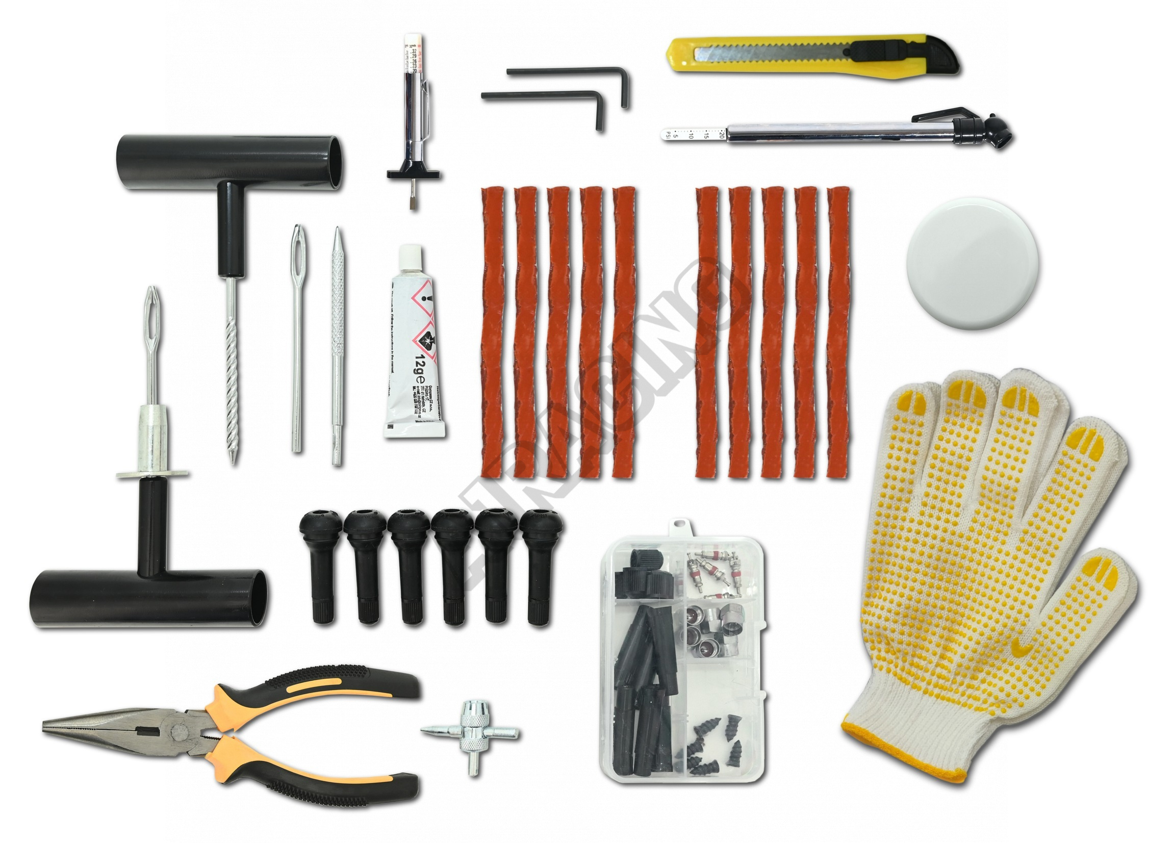 Sada obsahuje klasické opravné knoty včetně veškerého nářadí potřebného pro opravu, ale také vulkanizační šrouby, které opravu pneumatiky ještě více zjednoduší. Vulkanizační šrouby jsou speciální samořezné šrouby s hrubým závitem a vrstvou těsnicí hmoty. Součástí sady jsou rovněž další nástroje pro kontrolu stavu pneumatik, měříč hloubky dezénu a tlakoměr, dále pak rukavice pro pohodlnou manipulaci, lubrikant, klíč na ventilky, samotné ventilky včetně čepiček pro pneumatiky a nástavce pro ventilky.