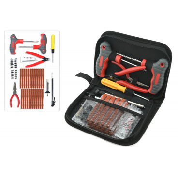 Sada obsahuje klasické opravné knoty včetně veškerého nářadí potřebného pro opravu, ale také vulkanizační šrouby, které opravu pneumatiky ještě více zjednoduší. Vulkanizační šrouby jsou speciální samořezné šrouby s hrubým závitem a vrstvou těsnicí hmoty. Součástí sady jsou rovněž další nástroje pro kontrolu stavu pneumatik, měříč hloubky dezénu a tlakoměr.