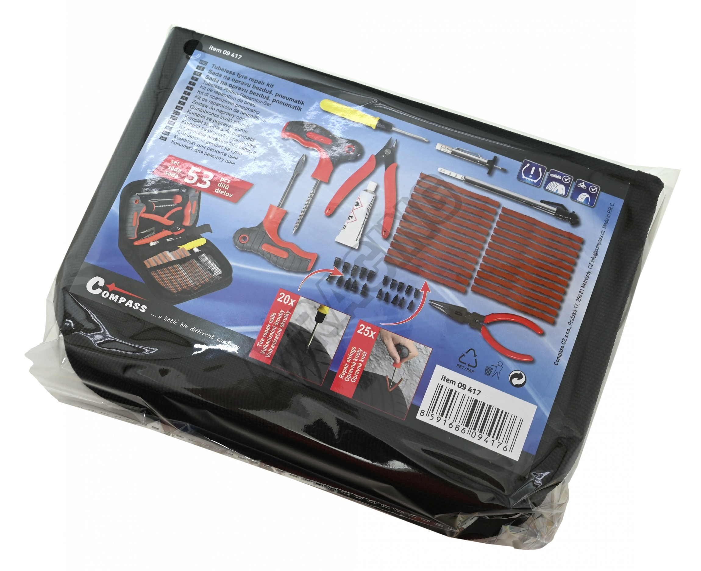 Sada na rychlou opravu bezdušových pneumatik bez nutnosti demontáže pláště z disku. Tato sada je vhodná bezdušové pneumatiky automobilů, motocyklů, čtyřkolek a dalších.