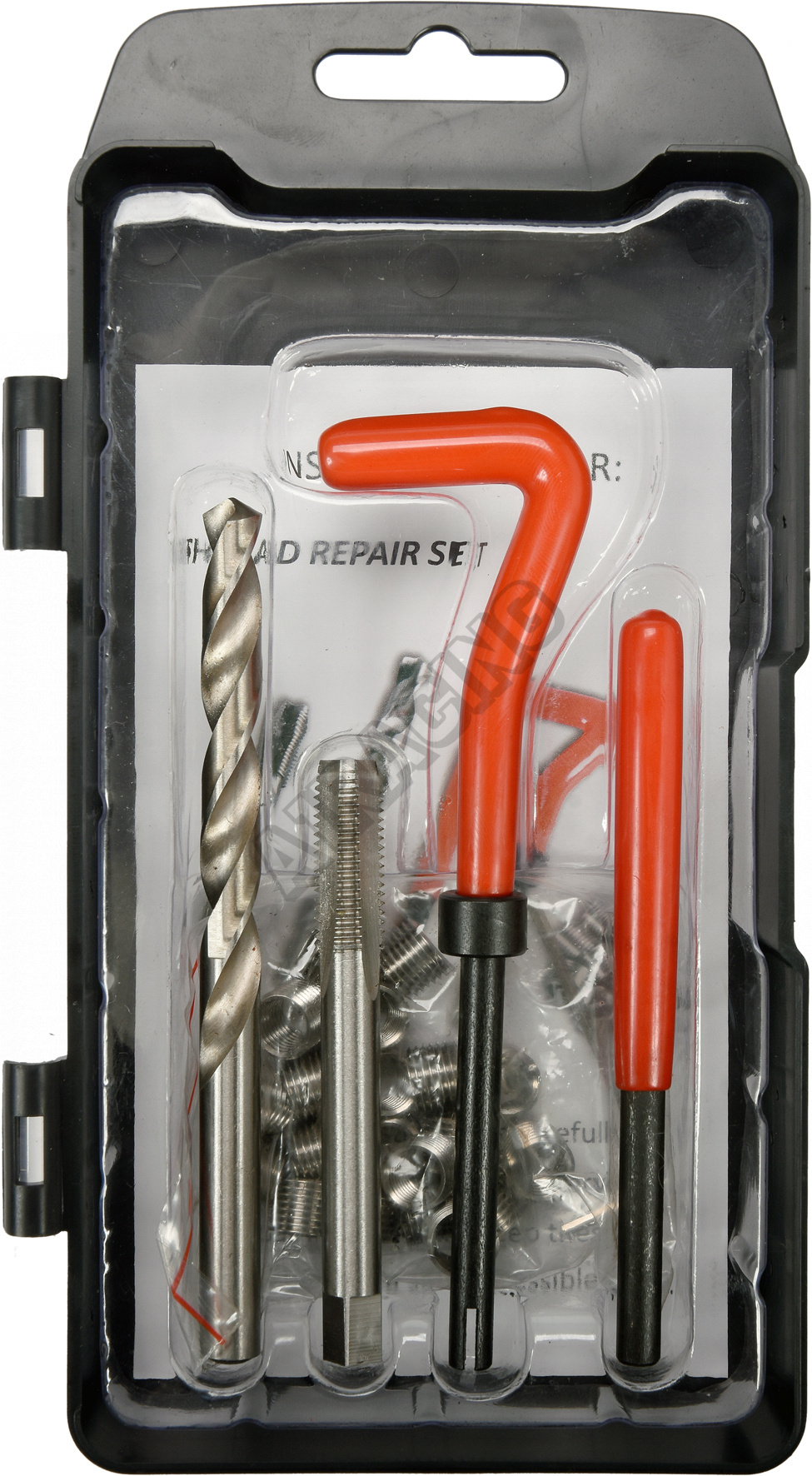 Dále lze závitové vložky využít pro výztuhu závitů v materiálech s nízkou pevností ve střihu např. alu nebo hořčíkové slitiny. Obsah je vrták, závitník, zavádeč, vyrážecí trn a závitové vložky z nerezové oceli.