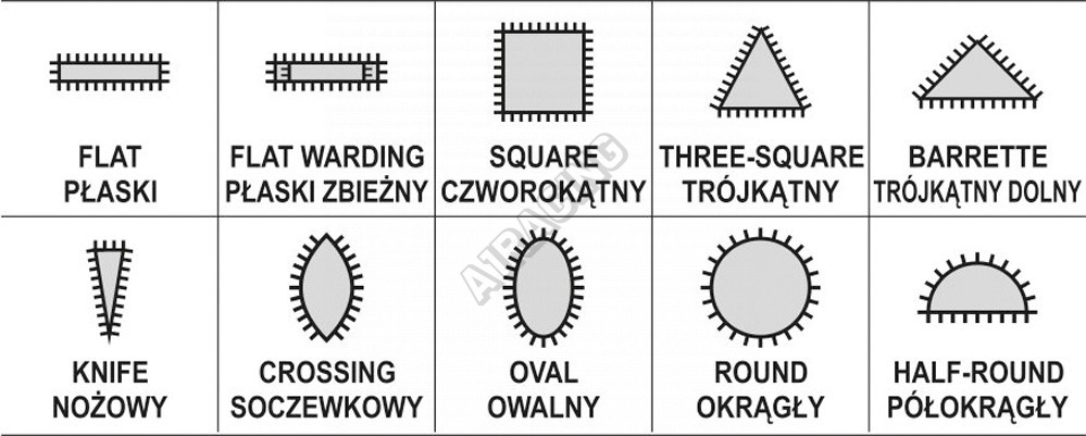 V sadě je plochý, kruhový, trojúhelníkový, nožový, oválný a další tvary pilníků.