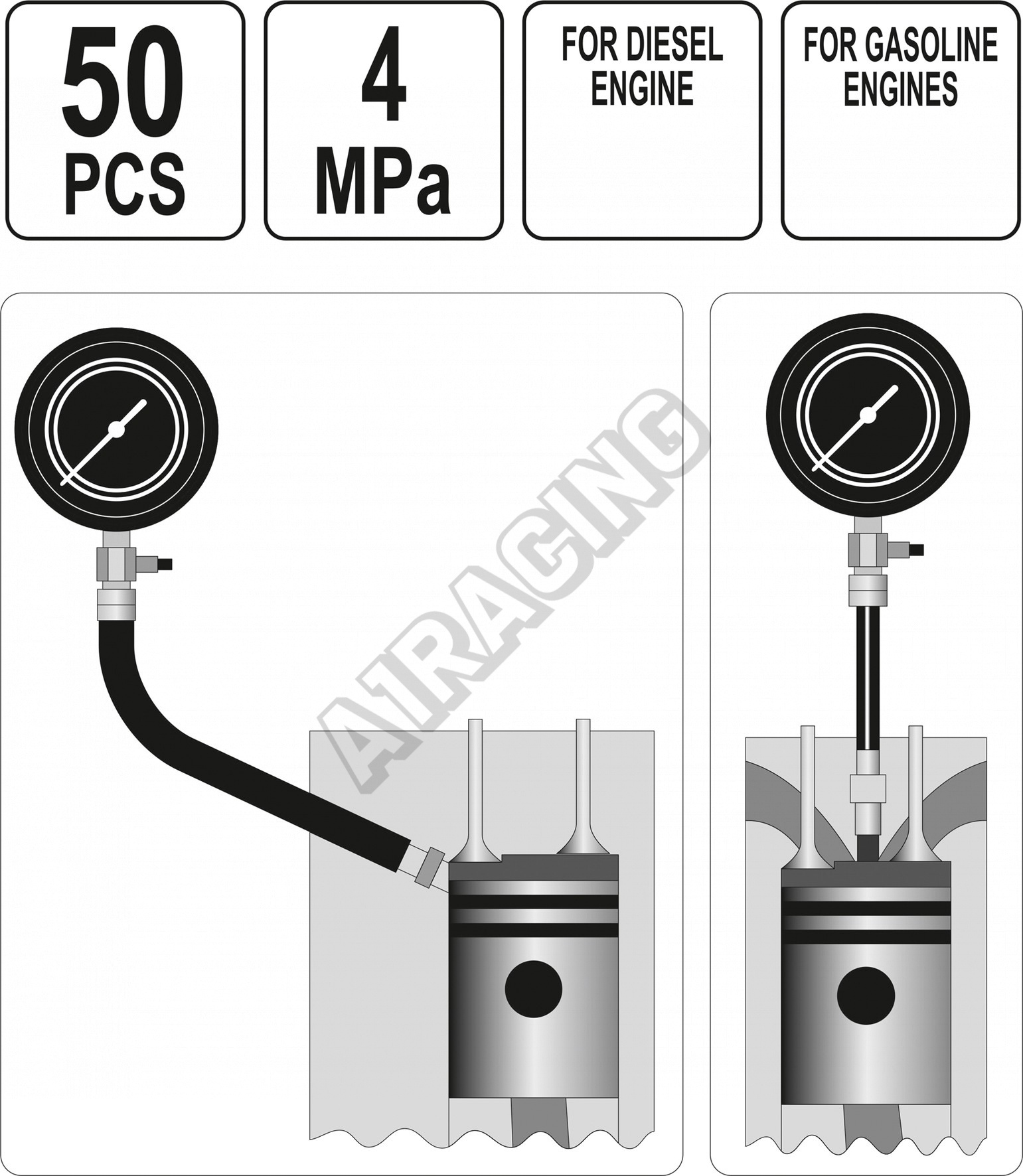 Určeno pro osobní automobily, dodávky, autobusy, traktory, zemědělská vozidla a dokonce i motorové čluny. Měření lze provádět v prostoru svíček případně vstřikovačů.
