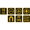 Sada 18ks šroubováků vyrobených z CrV6150 oceli s ergonomicky tvarovanými rukojeťmi z protikluzného PP a TPR.