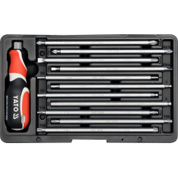 Šroubovák s vyměnitelnými bity, sada 12 kusů - Rukojeť z tříbarevného měkčeného plastu s protiskluzovou vrstvou umožňuje aplikovat oboustranné bity z kvalitní slitiny oceli SVCM dlouhé 175 mm.