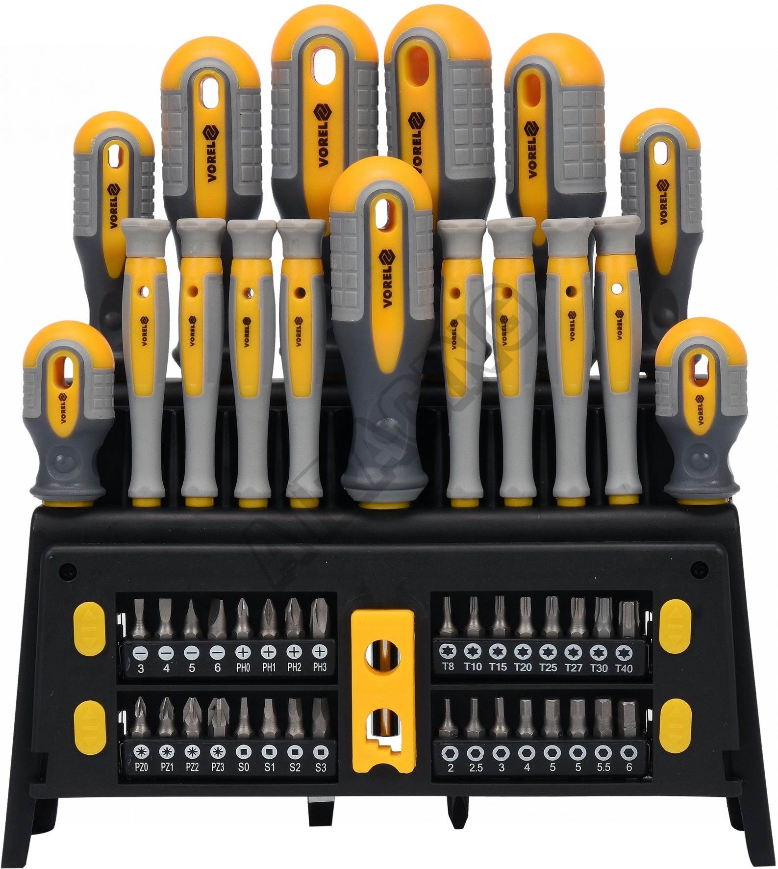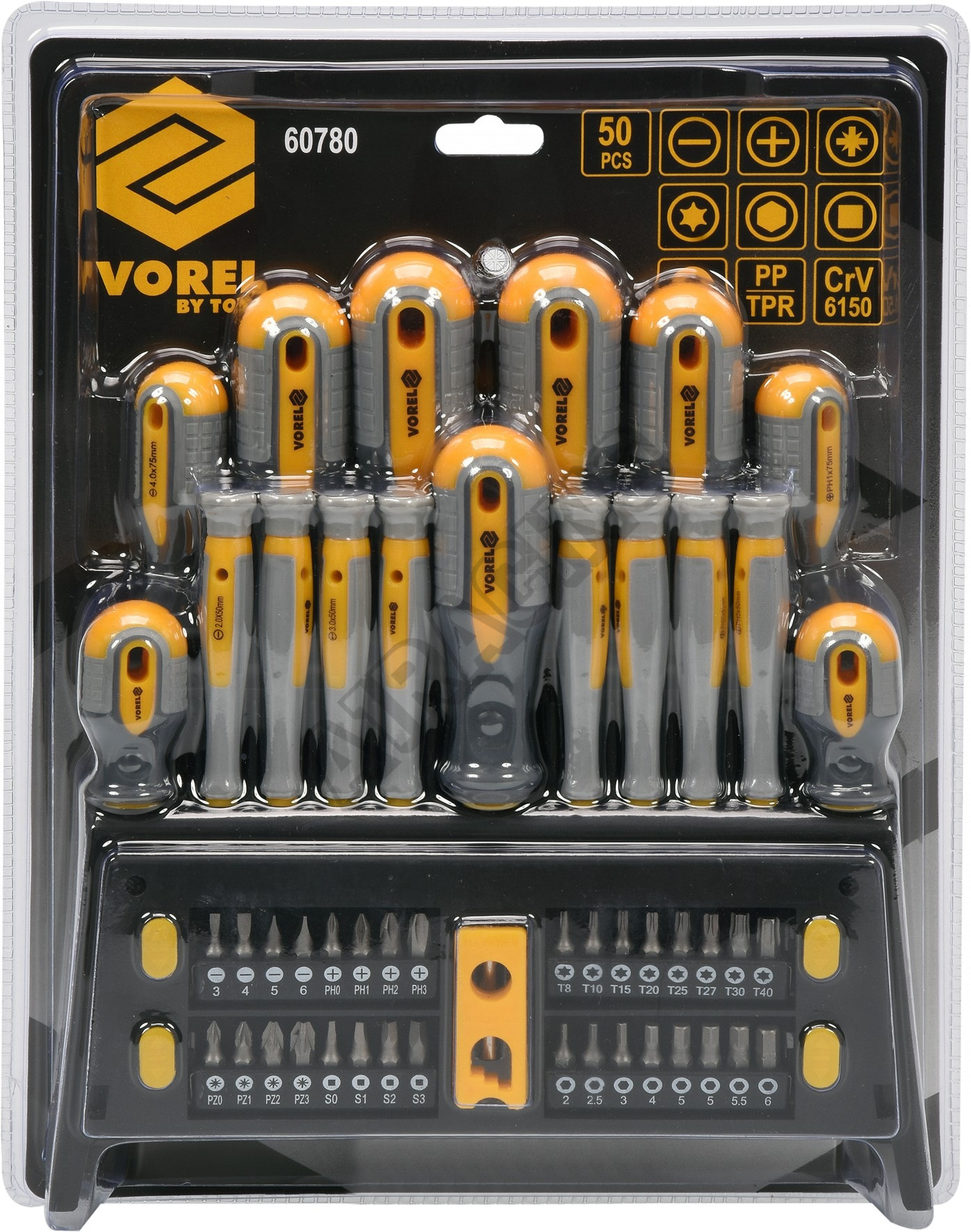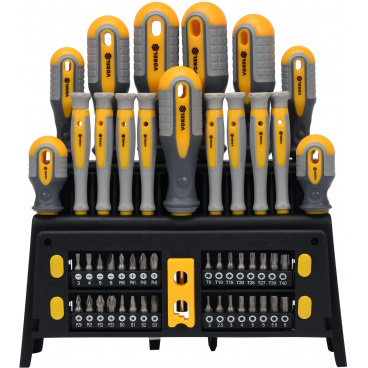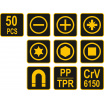 Sada 50ks šroubováků vyrobených z CrV6150 oceli s ergonomicky tvarovanými rukojeťmi z protikluzného PP a TPR.