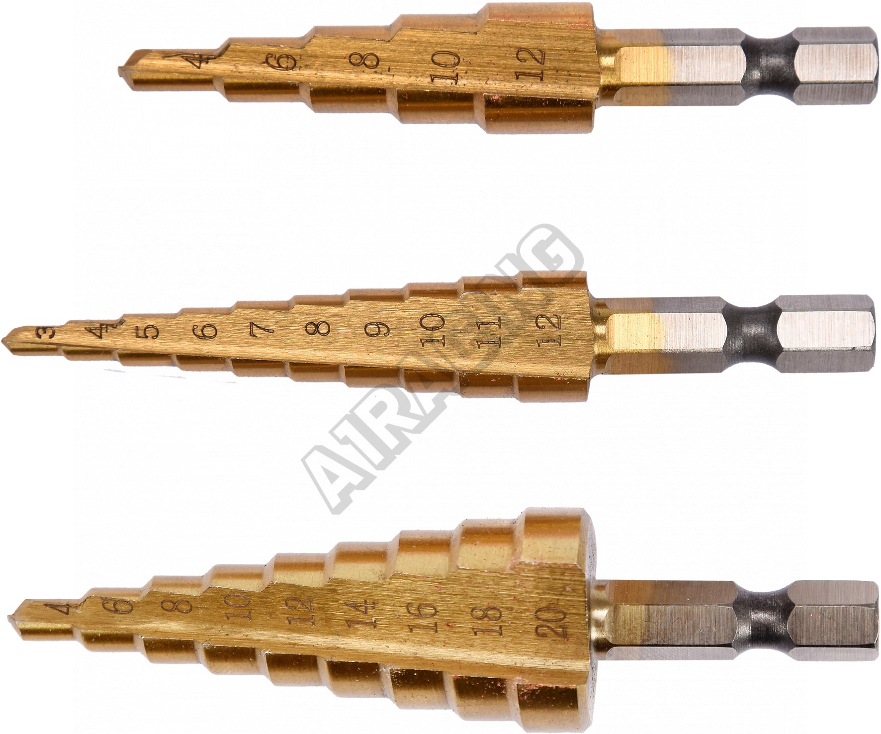Sada 3 ks stupňovitých kuželových vrtáků na kov umožňující postupné vyvrtání více průměrů otvorů. Vr