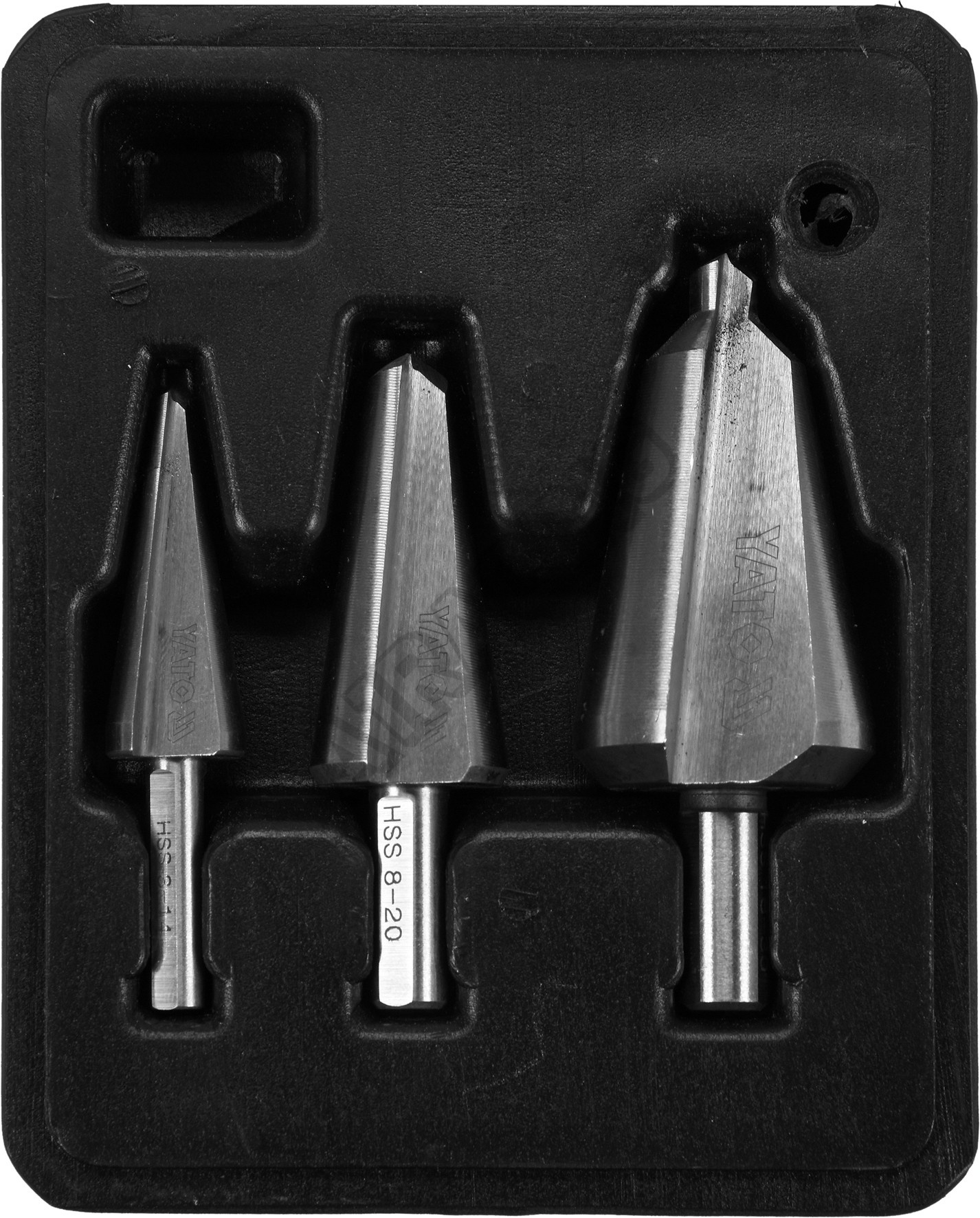 Sada 3 ks stupňovitých kuželových vrtáků na kov umožňující postupné vyvrtání více průměrů otvorů. Vr