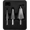 Sada 3 ks stupňovitých kuželových vrtáků na kov umožňující postupné vyvrtání více průměrů otvorů.