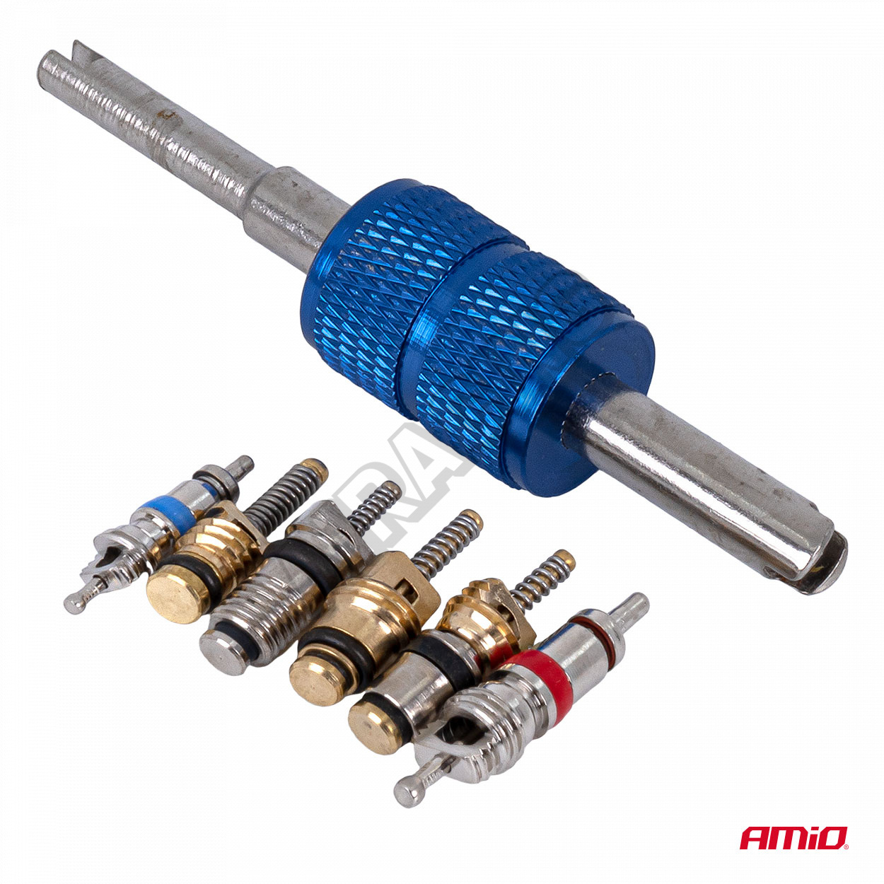 Profesionální sada ventilků pro klimatizaci, obsahující 61 prvků nezbytných pro servis a opravu klimatizačních systémů ve vozidlech a chladicích zařízeních. Sada umožňuje rychlou a přesnou výměnu ventilků v klimatizačních systémech, zajišťuje těsnost a správnou funkci instalace.