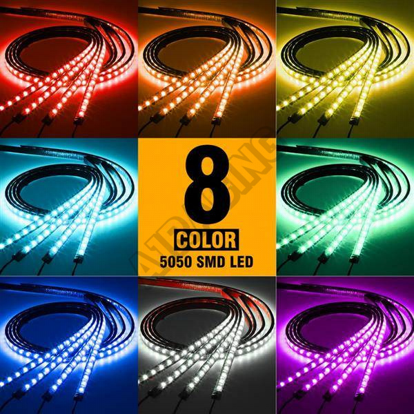 Sada vícebarevných led neonu pod auto na DO 2x90 a 2x120 cm (8 barev, několik možností frekvence blikání včetně možnosti blikání podle hudby)