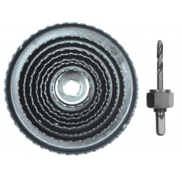Miskové vrtáky pro vyřezávání otvorů do dřeva, plastů, sádrokartonu, Ytongu (pórobetonu) a podobně. Sada obsahuje 8 průměrů vyřezávačů a upínací trn s vodícím středovým vrtákem.