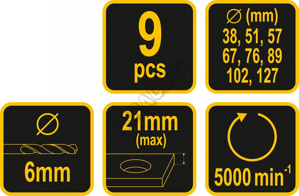 • Průměry vyřezávačů 38; 51; 57; 67; 76; 89; 102; 127mm