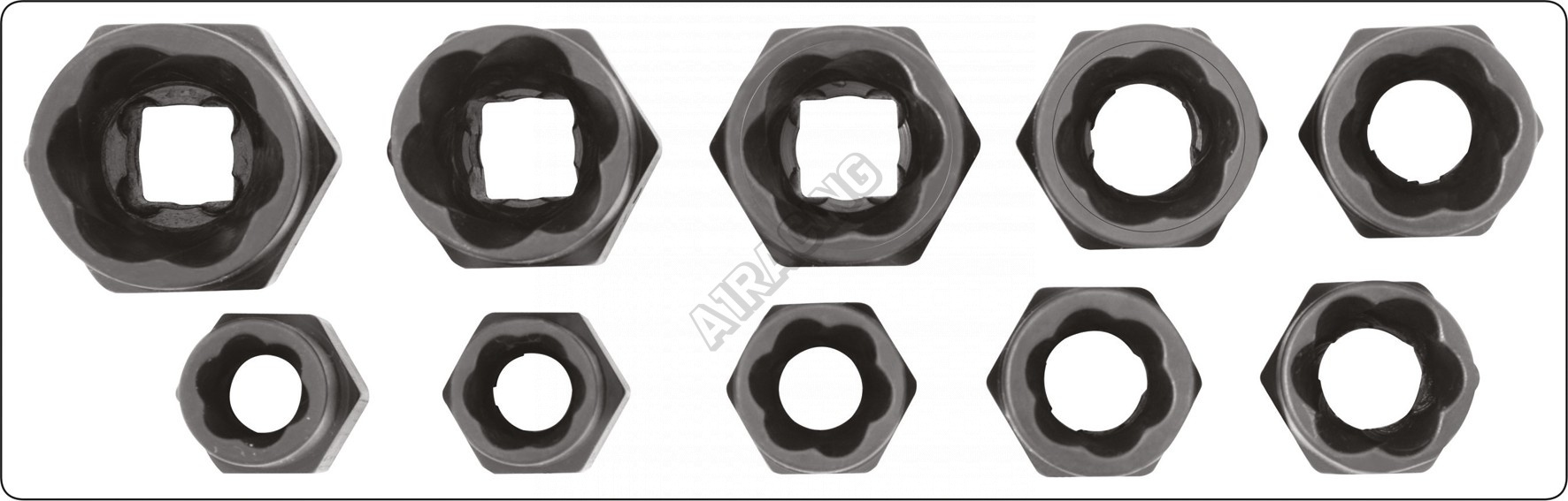 Nástrčné klíče pro poškozené, opracované šrouby, matice ve velikostech 9, 10, 11, 12, 13, 14, 15, 16, 17 a 19 mm mají speciální tvar, který umožňuje zaklínění poškozeného šroubu nebo matice, díky čemuž je poškozená část je odšroubován.