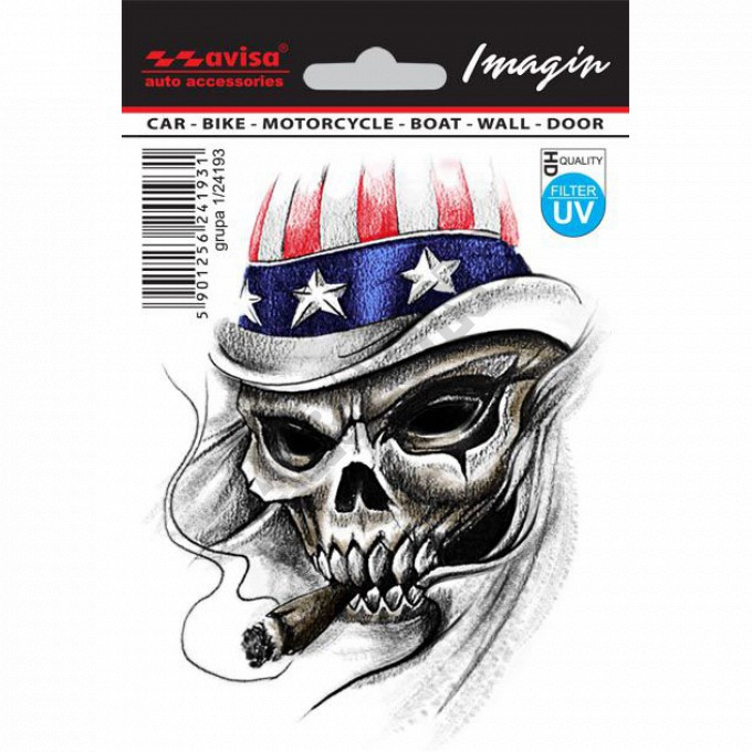 Samolepka lebka s cigárem USA Tištěná samolepka na trasparentní folii. Rozměr: 95 x 120 mm.