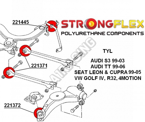 Seat Leon 4x4 StrongFlex Sport (tvrdost 90ShA) kompletní sestava silentbloků na celé auto obsahuje :