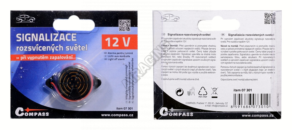 Při vypnutí zapalování, nebo při otevření dveří automobilu akusticky signalizuje nevypnuté světla vozidla. Ideální ochrana proti nechtěnému vybytí akumulátoru. Připevnění přilepením, nebo přišroubováním. Materiál plast, barva bílá.