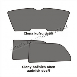 Sada - 3 dílů. Clony stíní zevnitř celou plochu oken. Jednoduchá montáž/demontáž nasazením zevnitř vozu. Clony jsou vyrobeny z černé tkaniny a mají ocelový pružný rámeček.