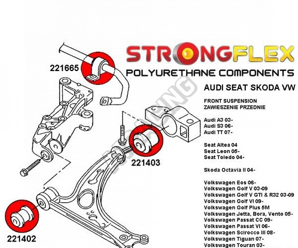 Škoda Octavia II StrongFlex (tvrdost 80ShA) kompletní sestava silentbloků na celé auto obsahuje :