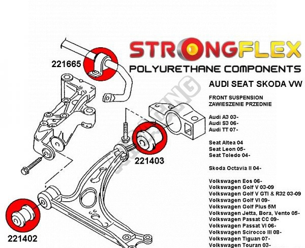 Škoda Octavia II 2004-... StrongFlex Sport sestava silentbloků jen pro přední nápravu 6 ks