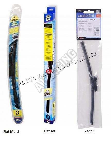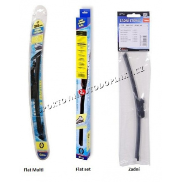 Stěrače FLAT SET (sada 2 ks na celé auto). Vysoce kvalitní pružný člen plochého stěrače zajišťuje stejnoměrný tlak grafitového břitu v celé jeho délce, což zamezuje rozmazávání nečistot a vytváření pruhů.