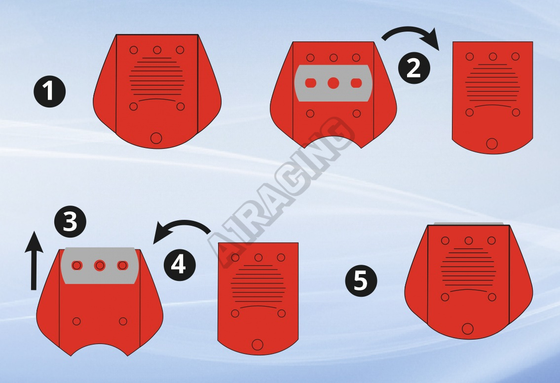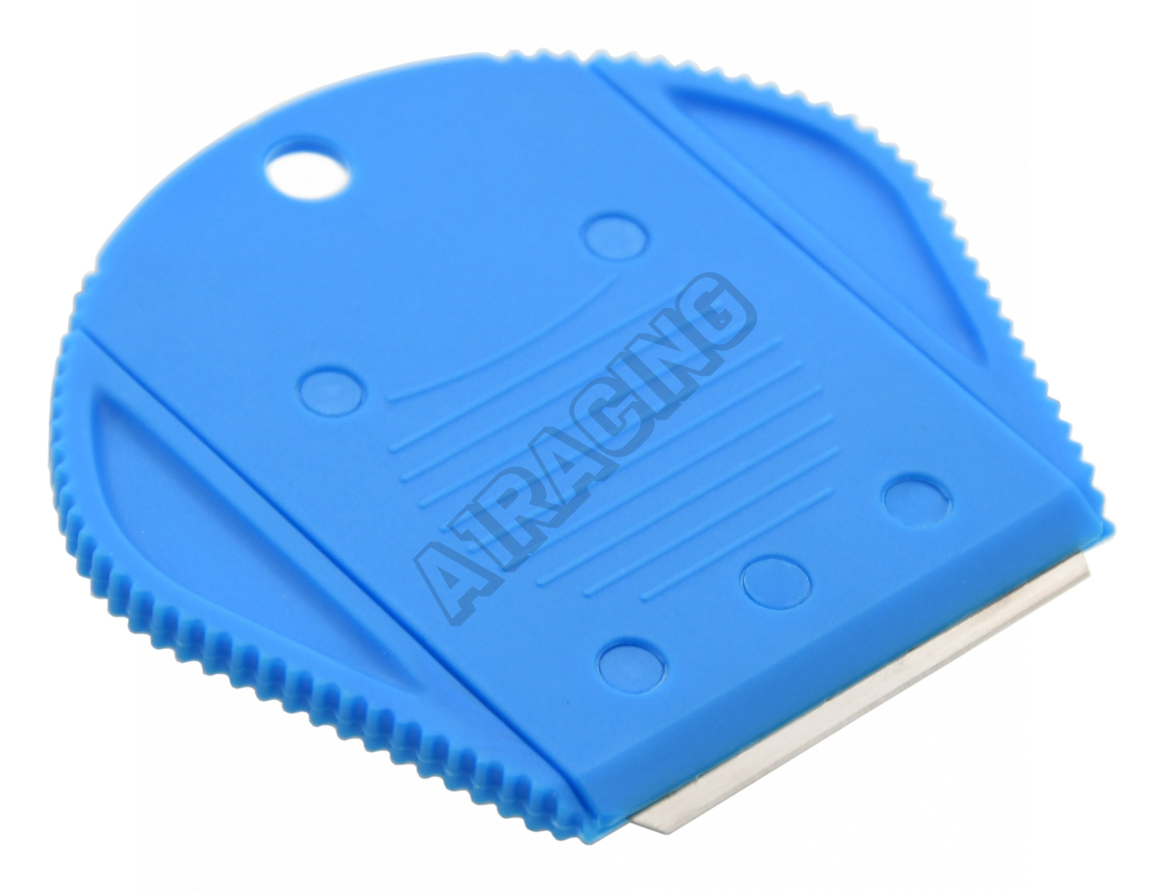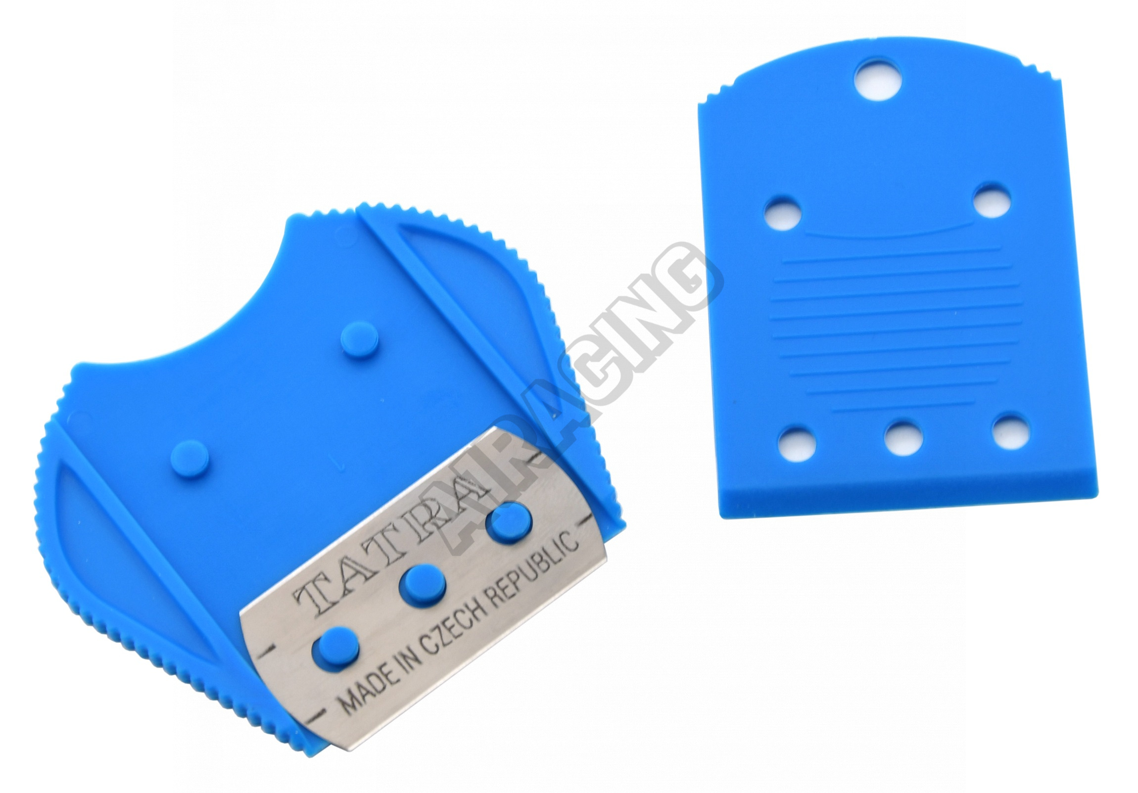 Škrabka je uvnitř osazena klasickou žiletkou české výroby, která snadno pronikne do vrstvy lepidla mezi sklo a nálepku. Žiletku lze po použití zasunout dovnitř, takže škrabku je možné snadno uschovat bez rizika zranění o ostrý břit.