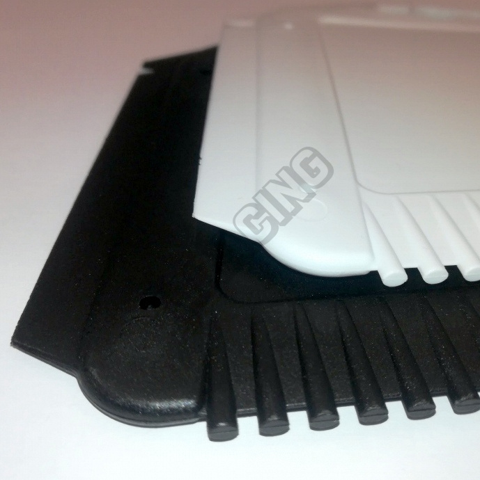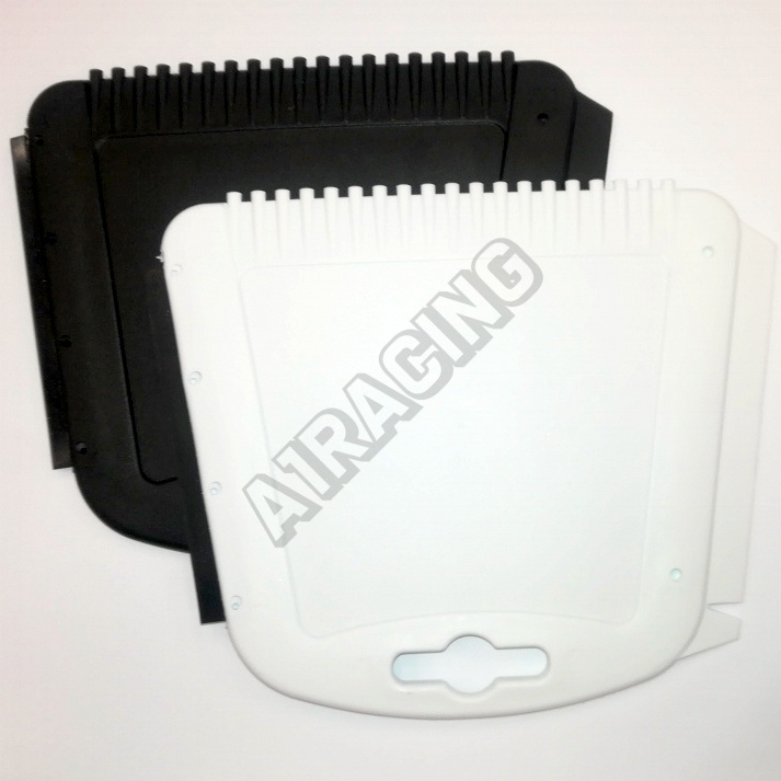 Plastová škrabka se třemi stranami (sníh, led, voda). Materiál plast. Barva většinou bílá nebo černá.