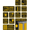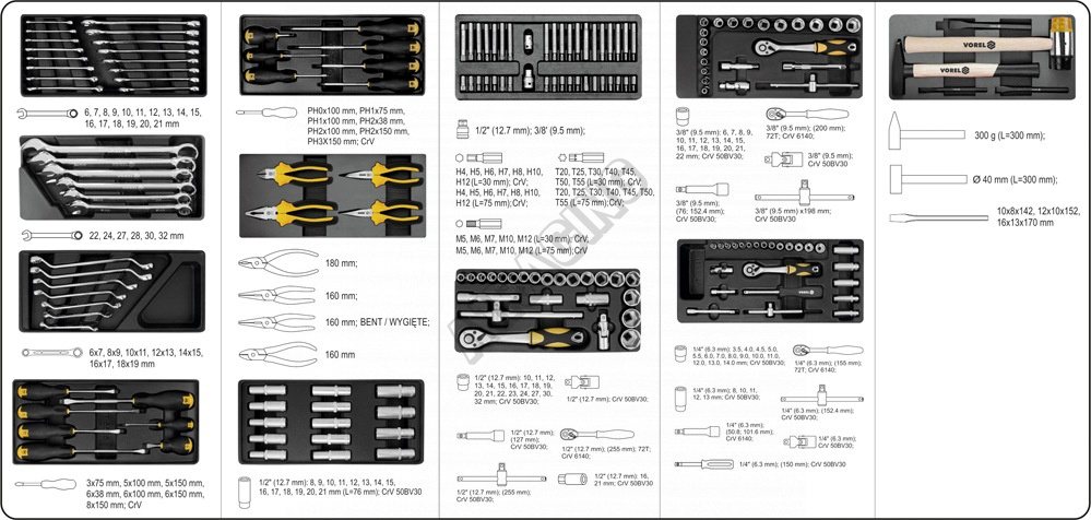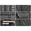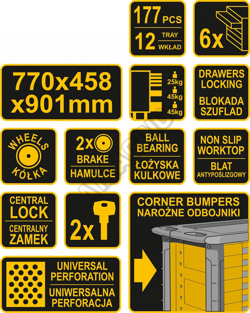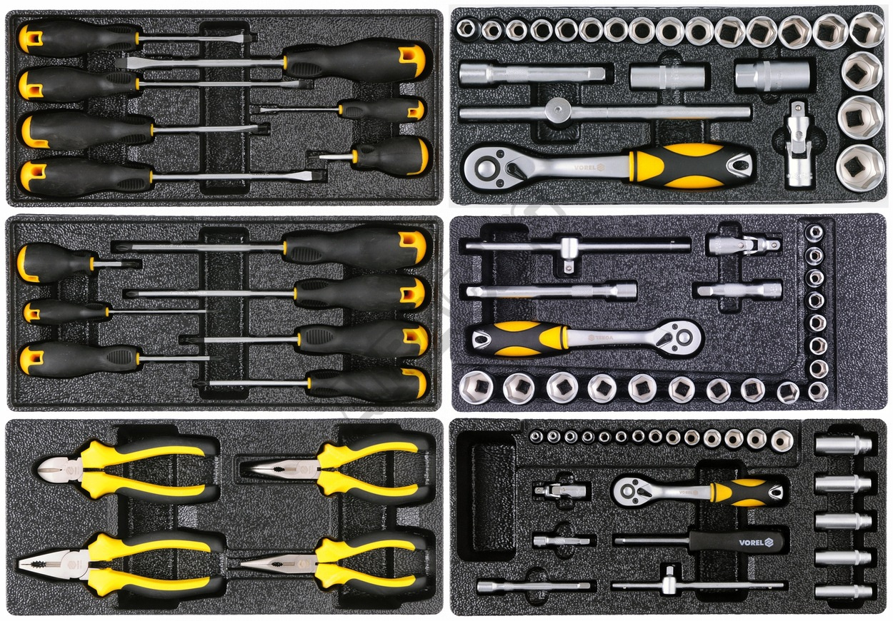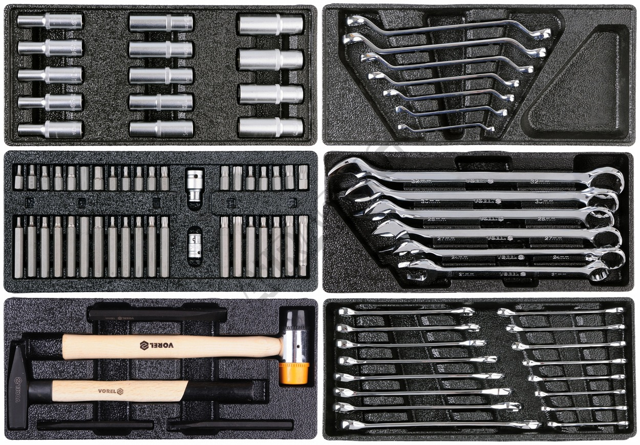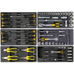 Pojízdná dílenská skříňka vyrobená z kvalitního ocelového plechu, nejen pro profesionální použití. První 4 šuplíky jsou vybaveny nářadím (celkem 177 ks) ve 12-ti plastových vložkách.