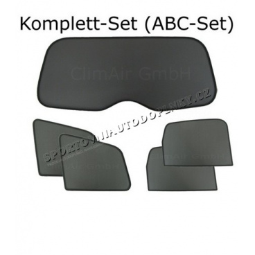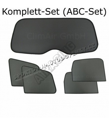Sada - 5-ti dílů. Clony stíní zevnitř celou plochu oken. Jednoduchá montáž/demontáž nasazením zevnitř vozu. Clony jsou vyrobeny z černé tkaniny a mají ocelový pružný rámeček.