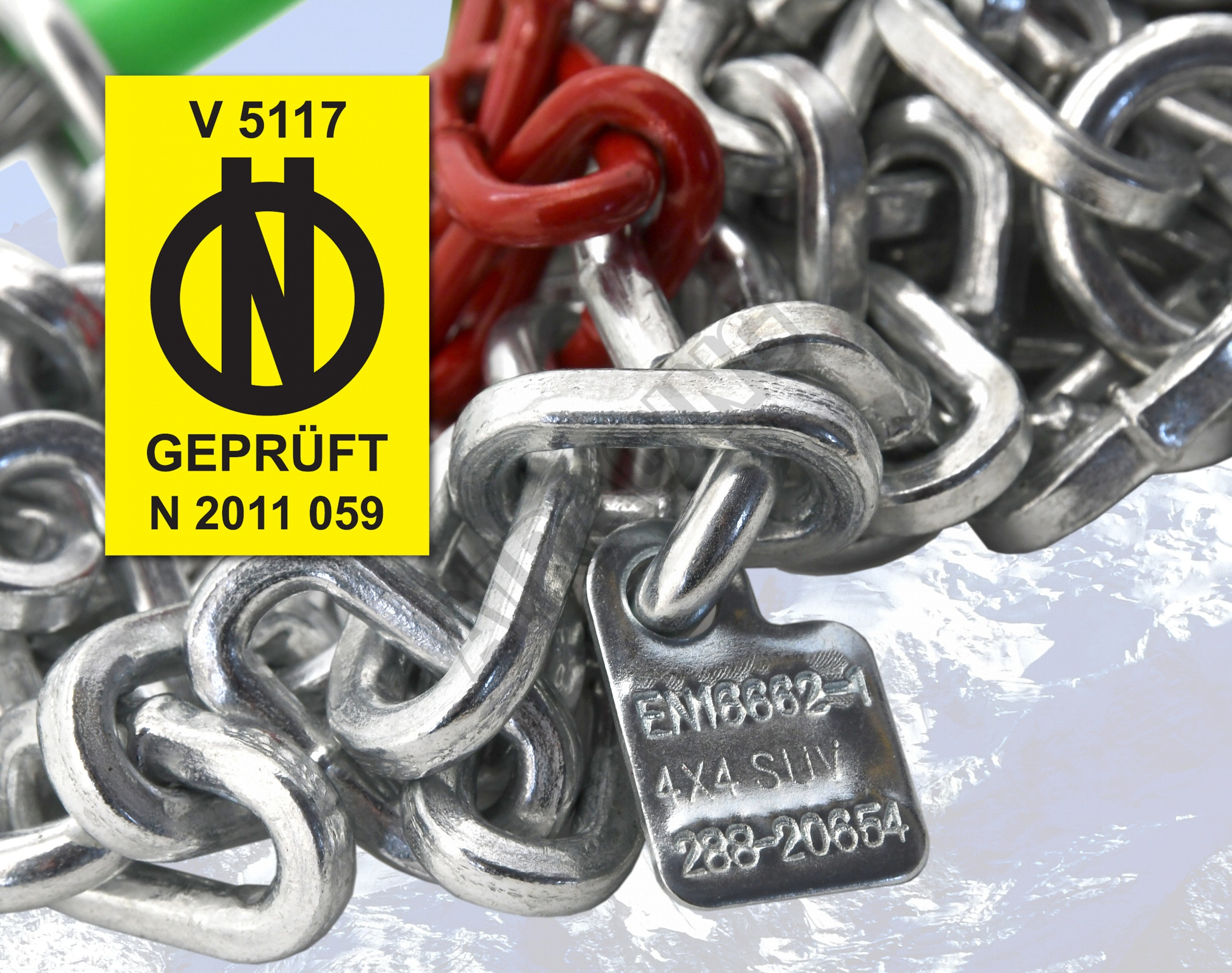 Sněhové řetězy, pro SUV/VAN do hmotnosti 7500 kg, splňující evropské normy včetně v Rakousku vyžadované "ÖNORM V 5117". Lze použít i pro dodávky a obytná vozidla.