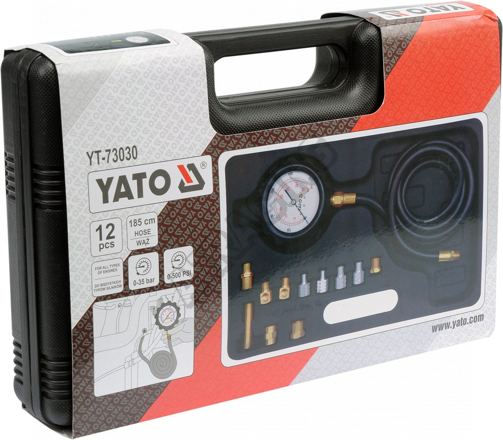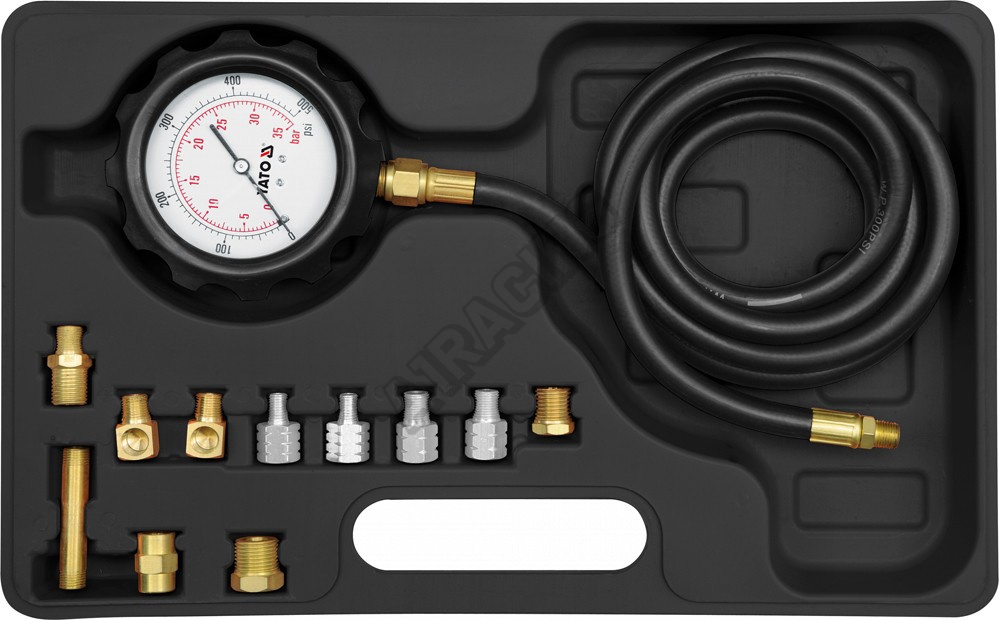 Profesionální tlakoměr oleje YATO. Dodává se s 12 redukcemi pro přizpůsobení rozchodu u většiny moto