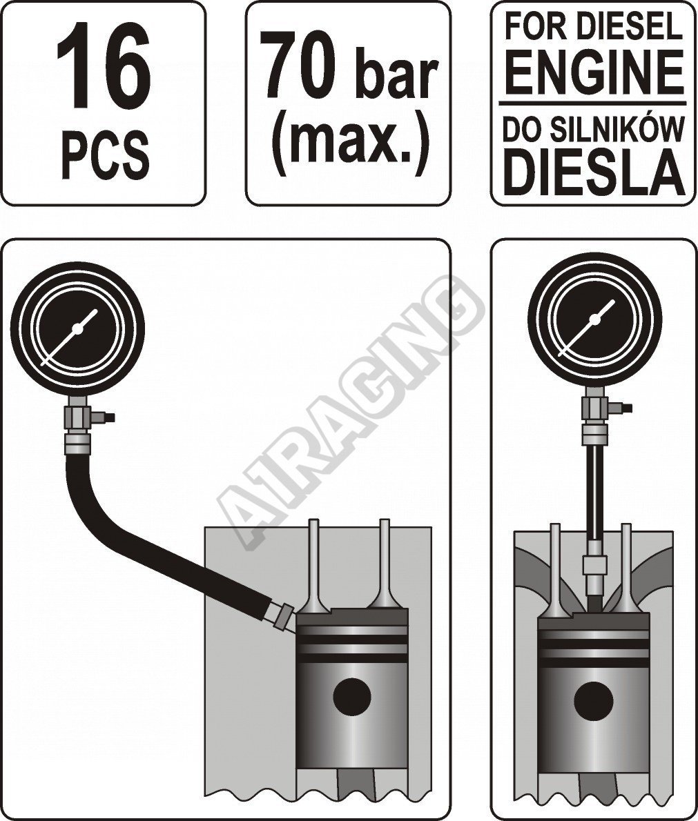 Pro měření komprese Dieselových motorů max 70 bar. Sada obsahuje adaptéry pro připojení měřiče k většině motorů běžných značek automobilů.
