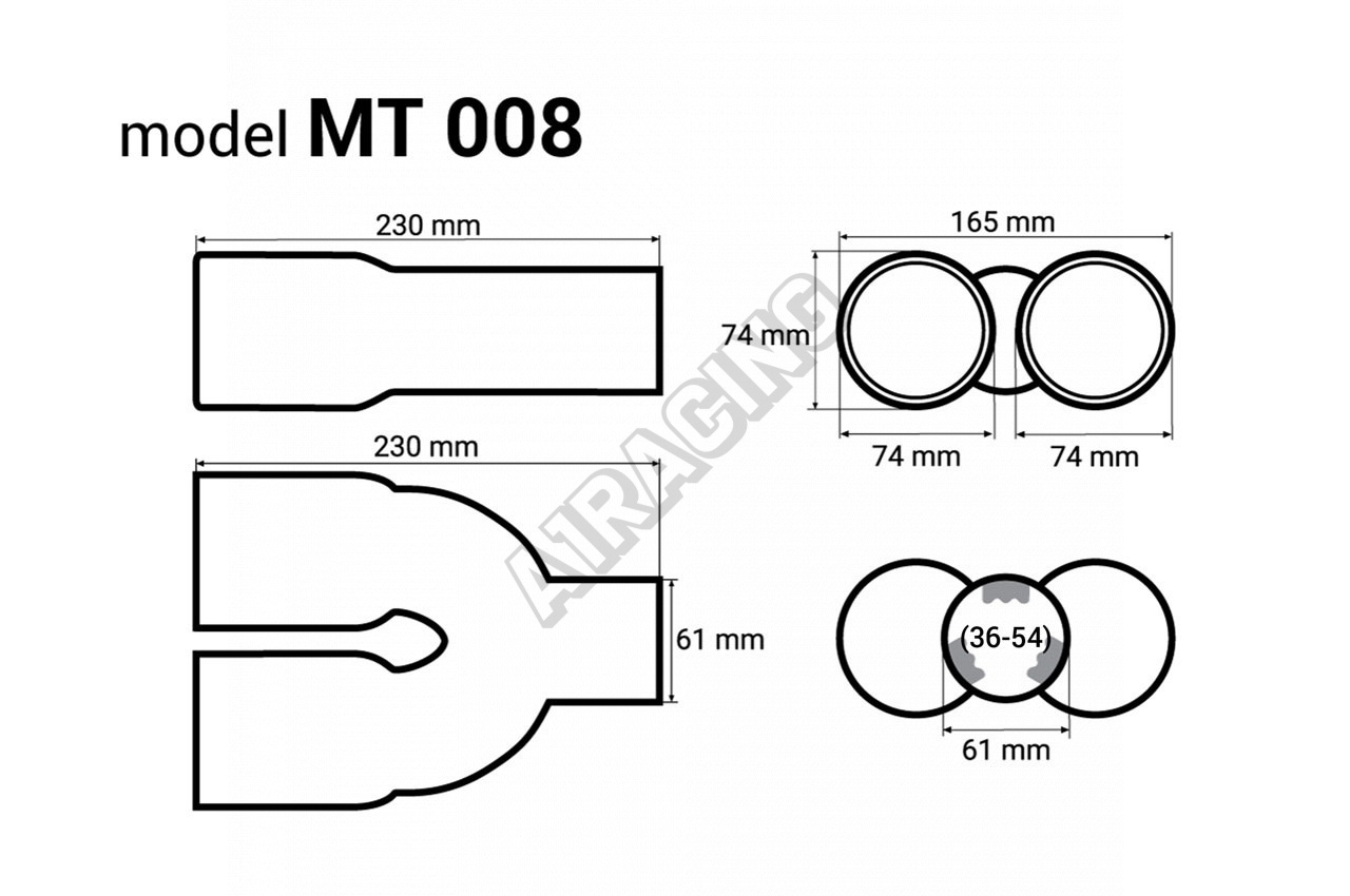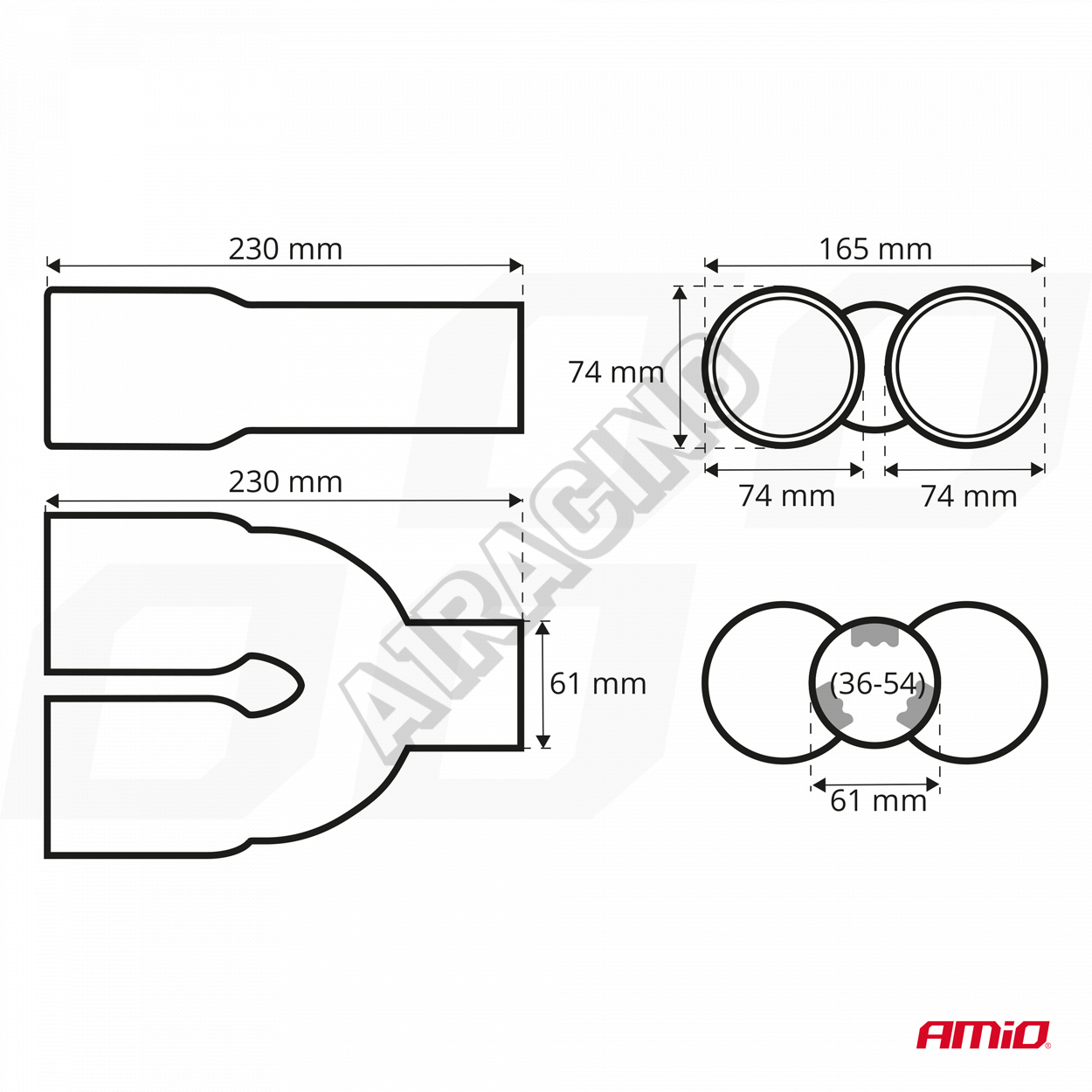 Rozměry výfukové koncovky: délka 230 mm, průměr koncovky 2 x 74 mm, průměr pro nasazení 36-54 mm
