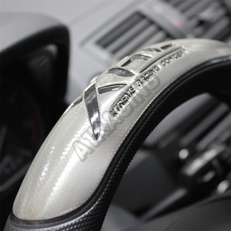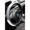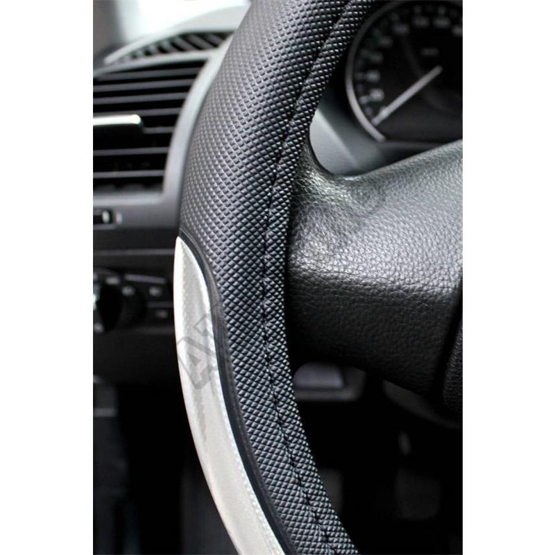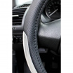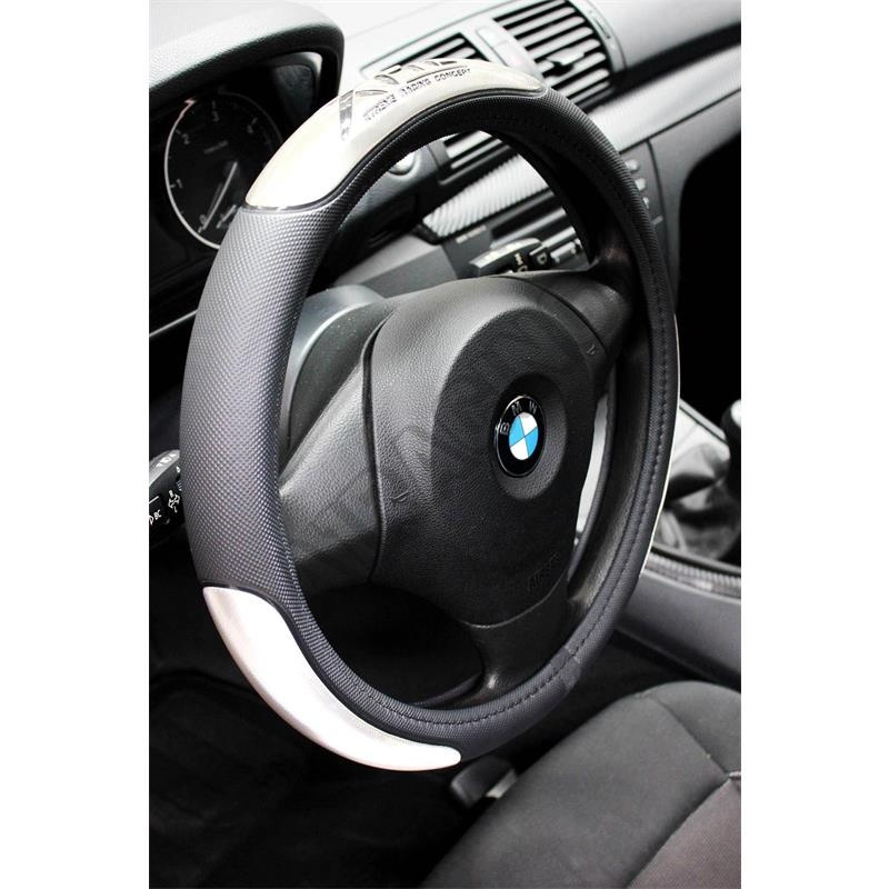 Černý potah volantu se stříbrným půlkruhovým detailem na každé straně. Průměr 37 až 39 cm umožňuje být univerzálním potahem pro jakýkoli typ auta, součástí jsou návlkeky pásů se suchým zipem na zadní straně, aby bylo zaručeno usazení. Tato sada dodá vašemu vozidlu kompletní sportovní vzhled.