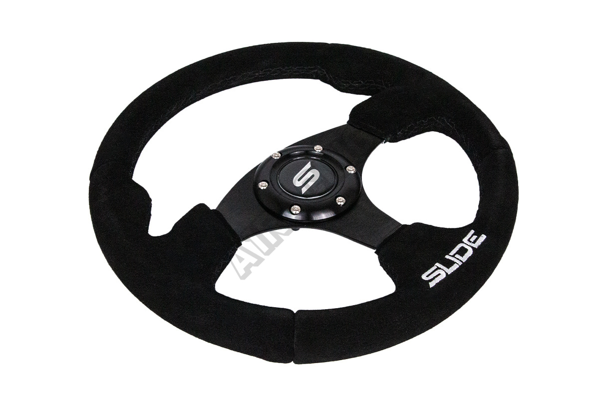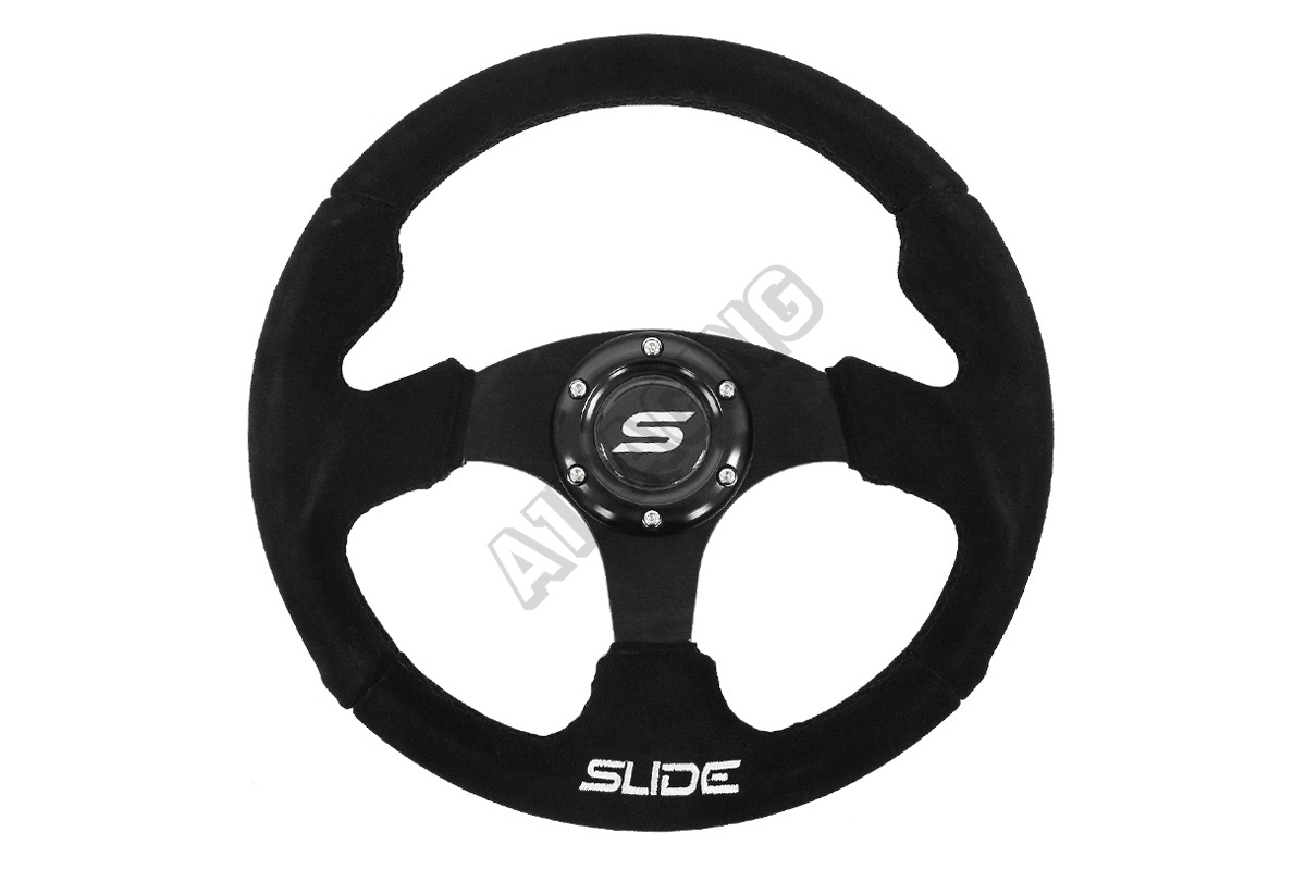 Krásný sportovní design v nekluzavém černém semiši. Výška věnce je od středu 2 cm, průměr volantu 350 mm, šířka věnce 35 mm, 3 ramena, tuhá konstrukce, určeno pro nábu 70 mm na 6 děr.