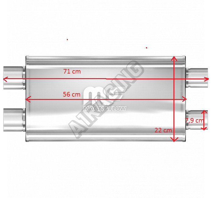 - délka výfuku včetně potrubí 71 cm, délka jen samotného těla 56 cm, šířka 29 cm, výška 15 cm, průměr potrubí 79 mm (vnější průměr)