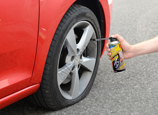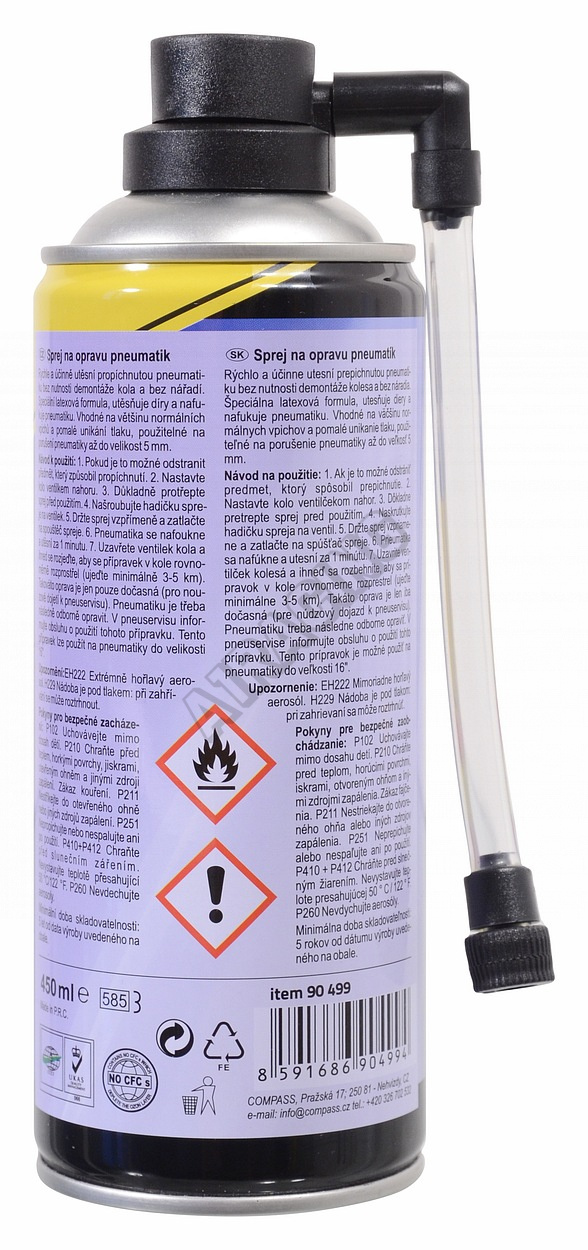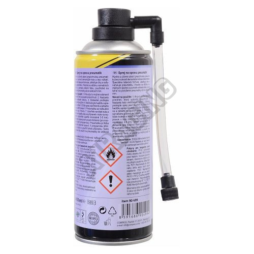 Návod k použití: 1. Pokud je to možné odstranit předmět, který způsobil propíchnutí. 2. Nastavte kolo ventilkem nahoru. 3. Důkladně protřepte sprej před použitím. 4. Našroubujte hadičku spreje na ventilek. 5. Držte sprej vzpřímeně a zatlačte na spouštěč spreje. 6. Pneumatika se nafoukne a utěsní za 1-3 minuty. 7. Uzavřete ventilek kola a ihned se rozjeďte, aby se přípravek v kole rovnoměrně rozprostřel (ujeďte minimálně 3-5 km). Takováto oprava jen pouze dočasná (pro nouzové dojetí k pneuservisu). Pneumatiku je třeba následně odborně opravit. V pneuservisu informujte obsluhu o použití tohoto přípravku.