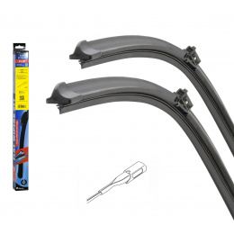Sada dvou plochých stěračů FLAT (řidič + spolujezdec) se speciálním uchycením. Délky stěračů a systé