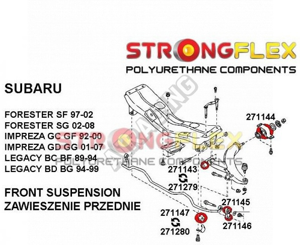 Subaru Legacy do 2006 BC BF StrongFlex Sport (tvrdost 90ShA) kompletní sestava silentbloků na celé auto obsahuje :