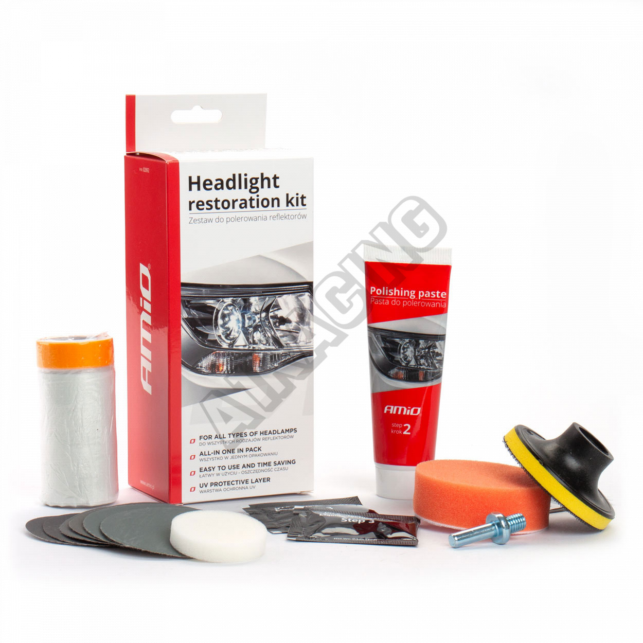 Sada navržená k obnovení původního lesku velmi zmatnělým, zažloutlým světlometům. Sada je určena ke zlepšení kvality svícení světlometů. 3 jednoduché kroky: broušení, leštění, ochrana Díky použití této sady není potřeba měnit světlomety za nové. Jednoduché na použití. Sada neobsahuje elektrickou leštičku. Navrženo pro obnovu dvou světlometů. Sada obsahuje: 2 x brusný papír, zrnitost P800 2 x brusný papír, zrnitost P1200 2 x brusný papír, zrnitost P2000 2 x houbička (1 x bílá, 1 x oranžová) 1x 85g tuba s lešticí pastou 2 x 3ml tekutina chránící před UV zářením 1 x maskovací páska (300*2 cm) 1 x držák 1 x adaptér se závitem M10