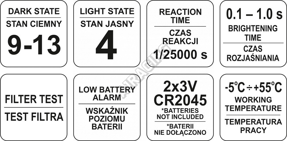 Doba rozjasnění 0,1-1,0 s., doba ztmavení 0,3-0,8 ms. Filtr navíc poskytuje ochranu proti UV / IR paprskům na úrovni DIN16. Přilba má plynulé nastavení citlivosti a stmívání, stejně jako postupné přizpůsobení rychlosti stmívání.