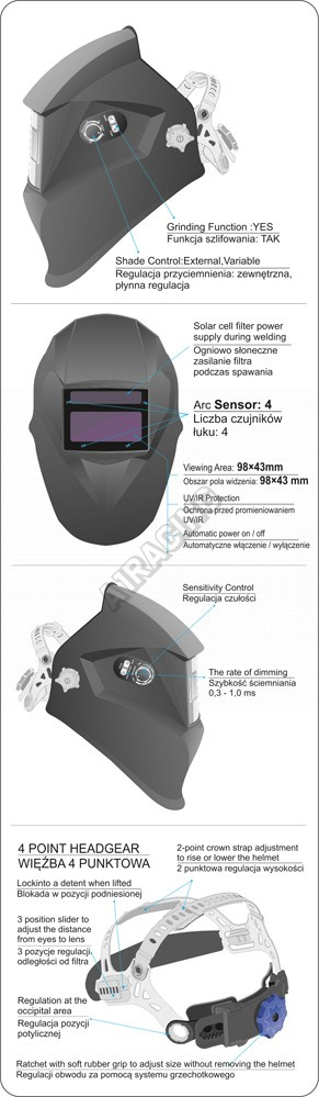 Svářečská kukla s automaticky ztmavujícím filtrem. Vysoce kvalitní filtr vybavený 4 obloukovými senzory poskytuje zorné pole 98 * 43 mm, DIN 9-13 tmavý stav, DIN4 světelný stav, doba odezvy 1/25000 s.