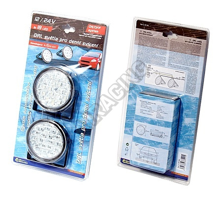 Homologovaná světla pro denní svícení, napájení 12 V. Každé světlo je osazeno 18x LED.