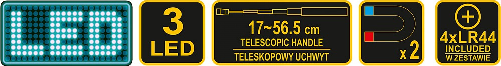 Svítilna je teleskopická (až 56,5 cm) a je vybavena ohebným krkem pro snadné přizpůsobení světla. Napájení 4x baterie LR44 (jsou součástí balení).