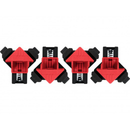 Sada čtyř silných, odpružených úhlových svorek, určených k sevření spojovaných prvků pod úhlem 90 stupňů.
