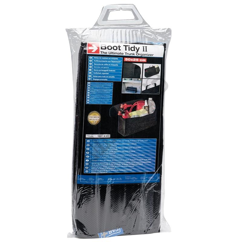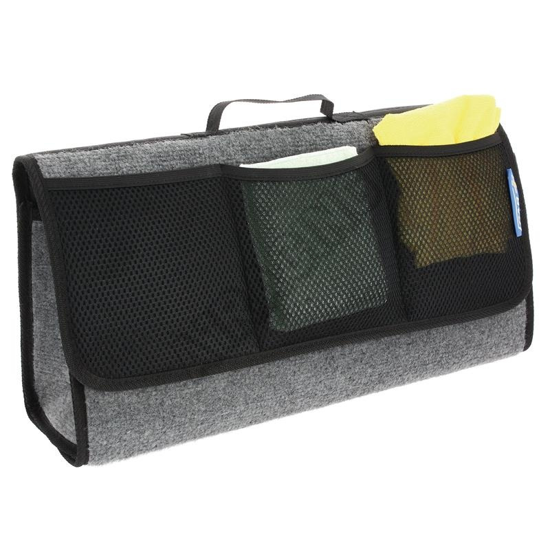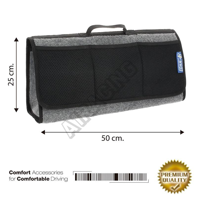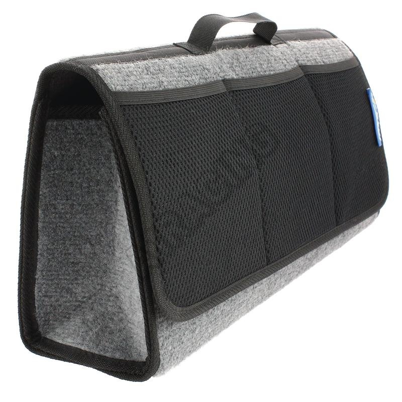Pohodlná taška pro uložení všech potřeb do kufru automobilu s rukojetí a uzávěrem na suchý zip. Pásek na suchý zip na zadní a spodní straně je určen pro bezpečné uchycení na vnitřní koberec čalounění.