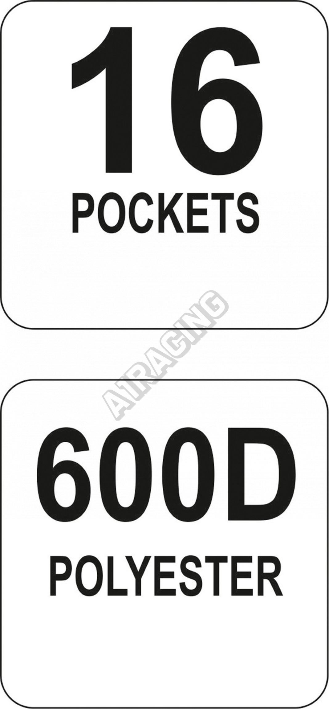 Praktická taška na nářadí zhotovená z odolného polyesteru 600D se zesíleným dnem odolným proti vlhkosti.